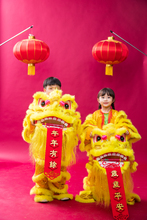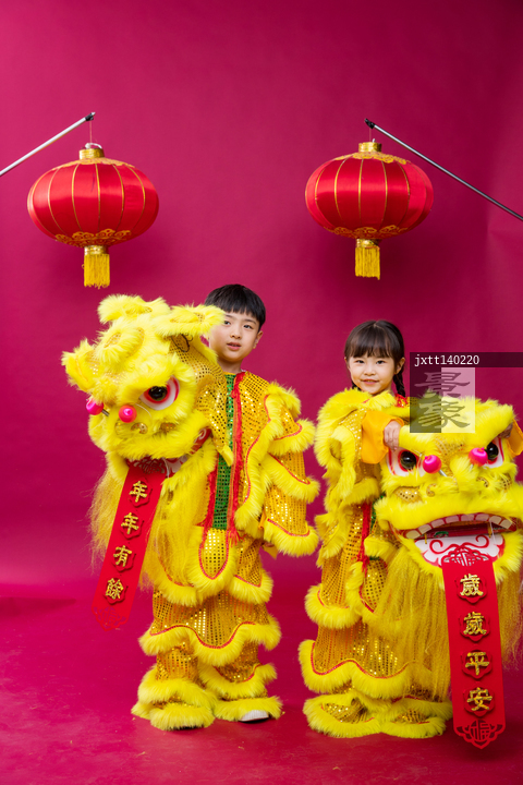图片标题: 舞狮子的男孩女孩庆祝新年