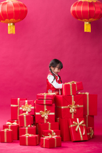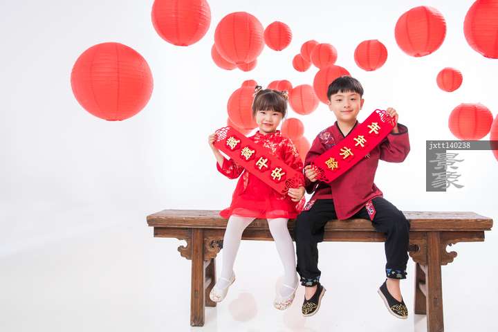 图片标题: 欢乐的男孩女孩拿着春联庆祝新春