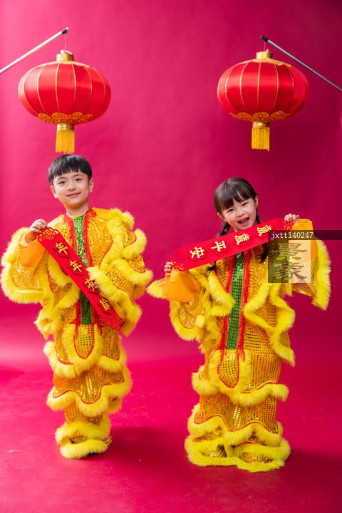 图片标题:     舞狮子的男孩女孩庆祝新年