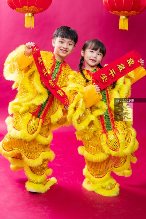 图片标题: 舞狮子的男孩女孩庆祝新年