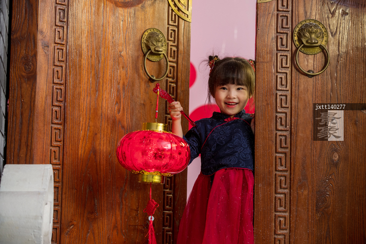 图片标题: 可爱的小女孩拿着红灯笼站在大门口
