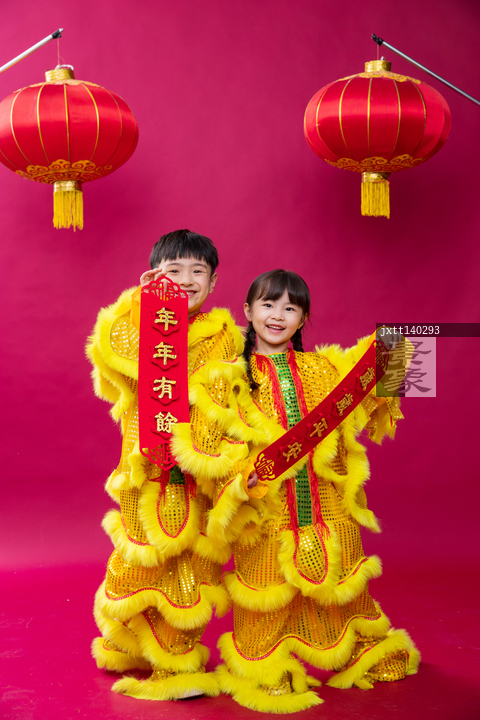 图片标题: 舞狮子的男孩女孩庆祝新年
