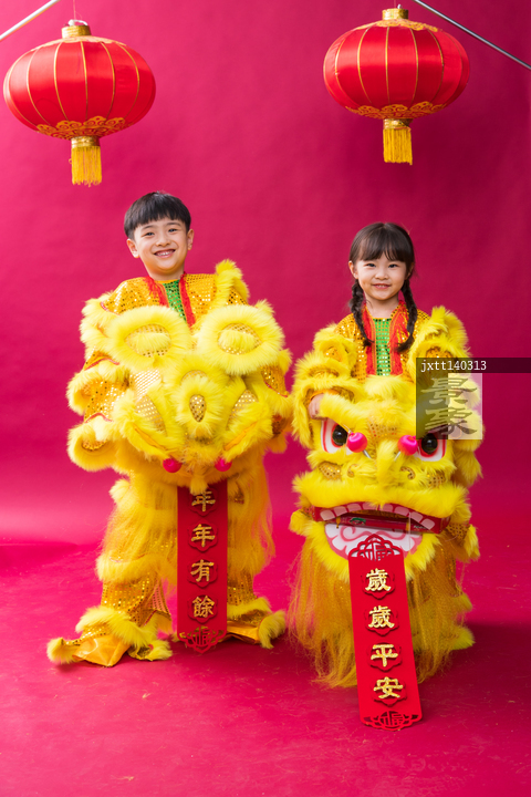 图片标题: 舞狮子的男孩女孩庆祝新年