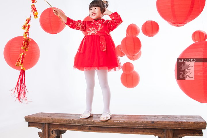 图片标题: 快乐的小女孩拿着红灯笼玩耍