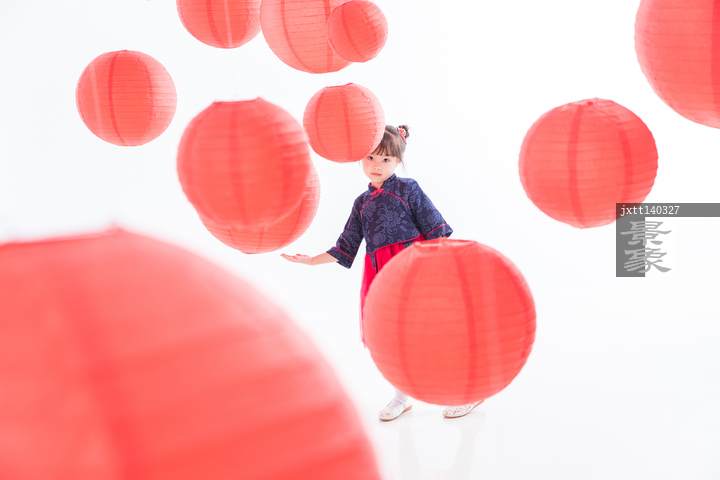 图片标题: 红灯笼下玩耍的快乐女孩