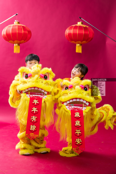图片标题: 舞狮子的男孩女孩庆祝新年