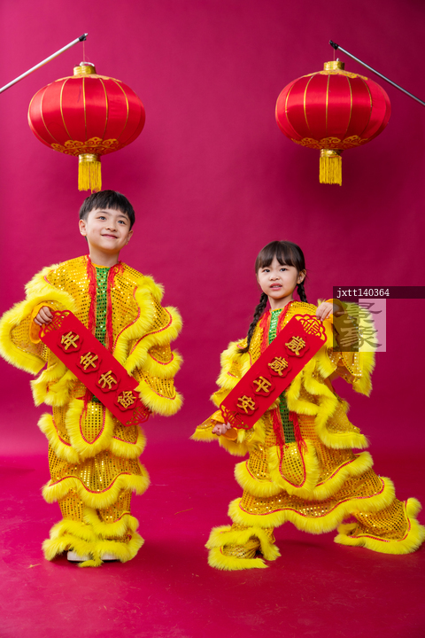 图片标题:     舞狮子的男孩女孩庆祝新年