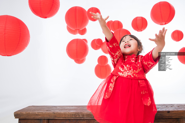 图片标题: 快乐的小女孩拿着红灯笼玩耍