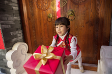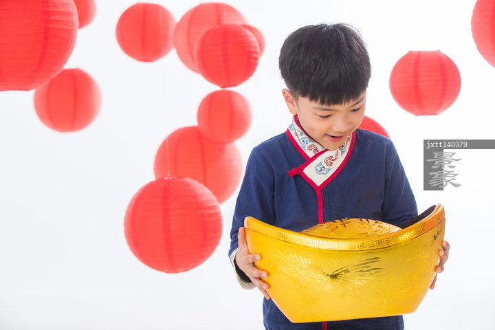 图片标题: 快乐的小男孩抱着金元宝