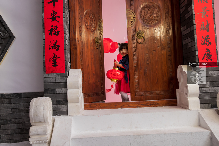 图片标题: 可爱的小女孩拿着红灯笼站在大门口
