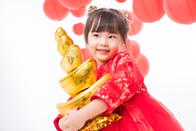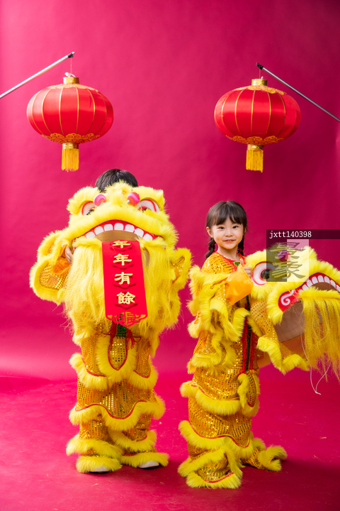 图片标题: 舞狮子的男孩女孩庆祝新年