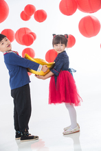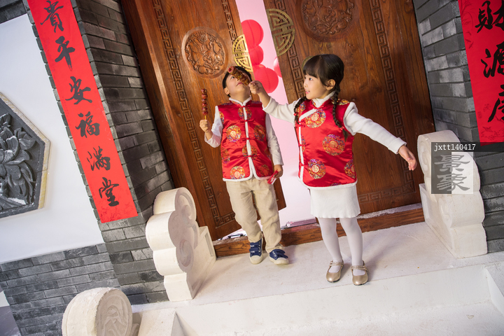 图片标题: 可爱的男孩女孩在门口吃糖葫芦