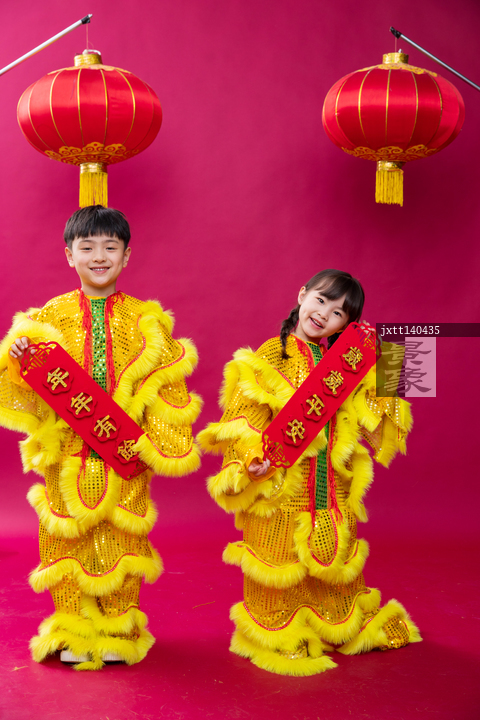 图片标题: 舞狮子的男孩女孩庆祝新年