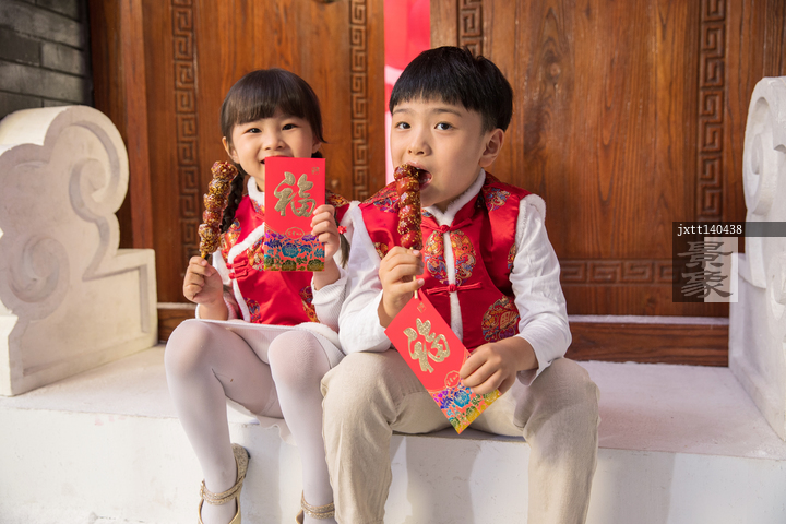 图片标题: 可爱的男孩女孩坐在门口吃糖葫芦