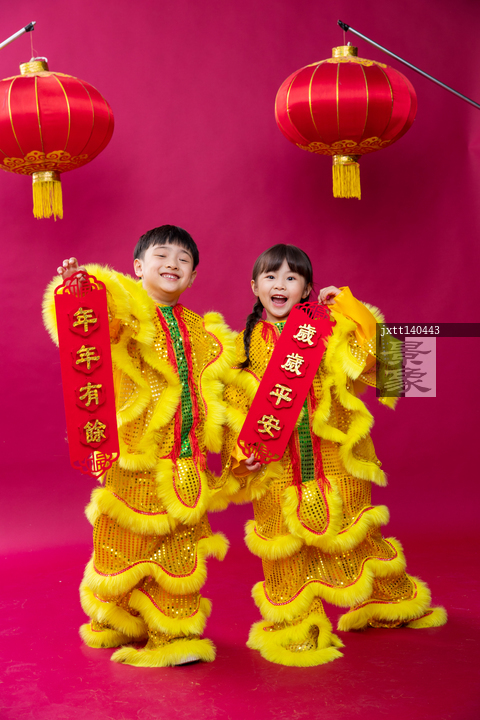 图片标题: 舞狮子的男孩女孩庆祝新年