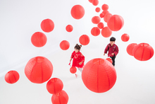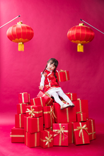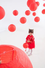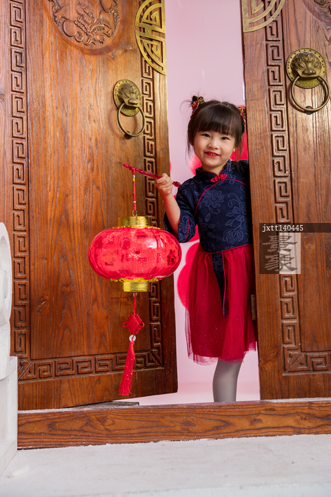图片标题: 可爱的小女孩拿着红灯笼站在大门口