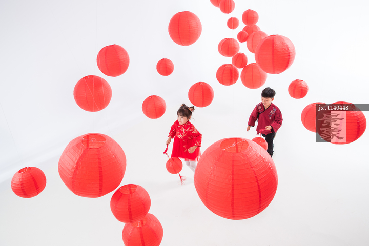 图片标题: 快乐儿童在红灯笼下玩耍