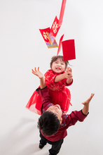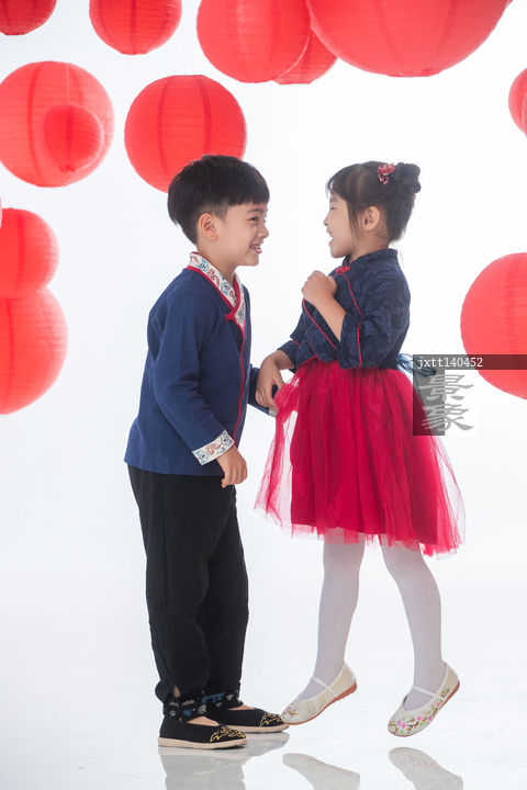 图片标题: 红灯笼下玩耍的快乐男孩和女孩