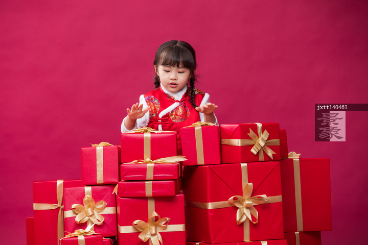 图片标题: 快乐的小女孩拿着新年礼物