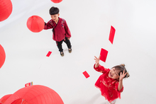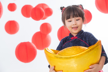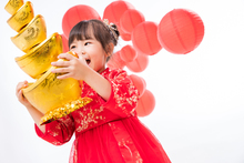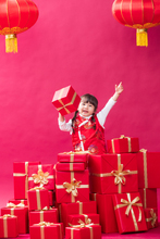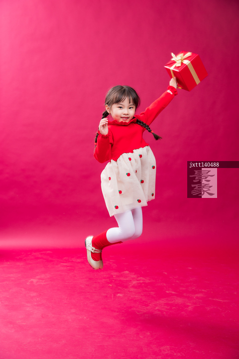 图片标题: 拿着新年礼物跳跃的快乐小女孩