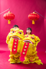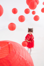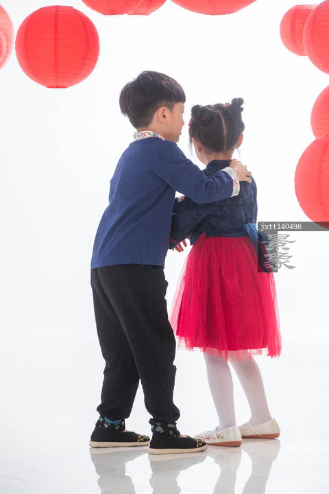 图片标题: 红灯笼下玩耍的快乐男孩和女孩
