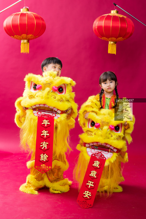 图片标题: 舞狮子的男孩女孩庆祝新年