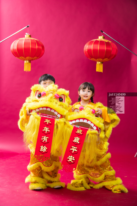 图片标题: 舞狮子的男孩女孩庆祝新年