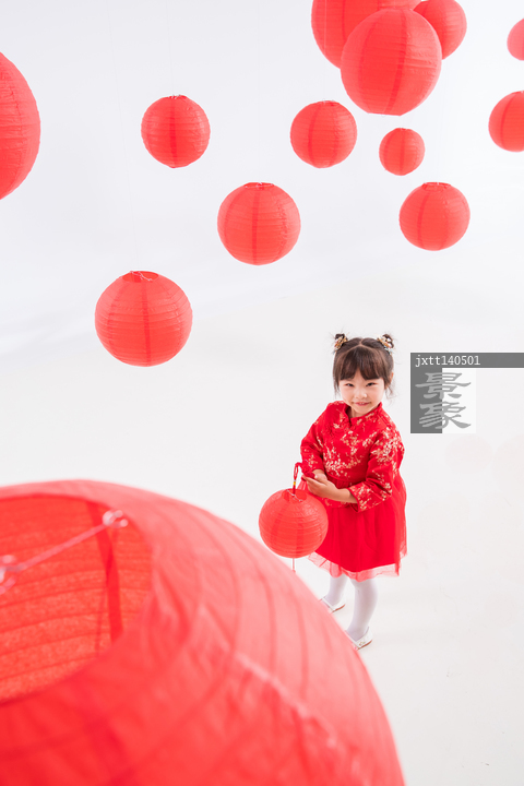 图片标题: 快乐的小女孩在红灯笼下玩耍