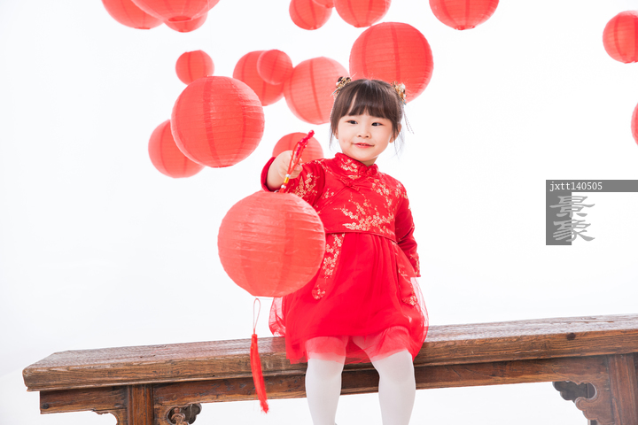 图片标题: 快乐的小女孩拿着红灯笼玩耍