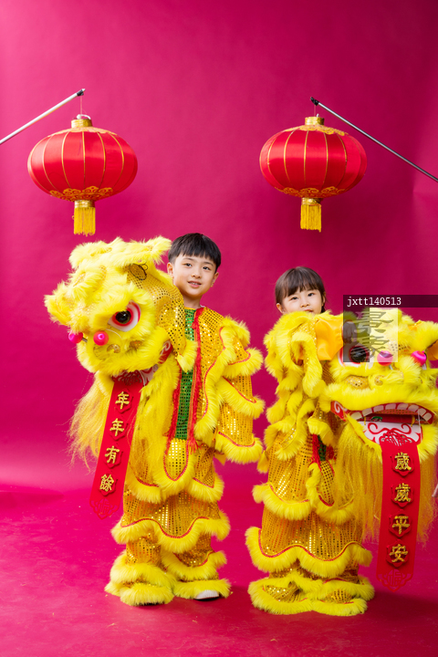 图片标题: 舞狮子的男孩女孩庆祝新年