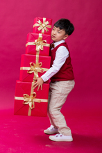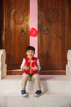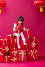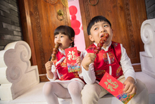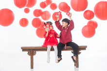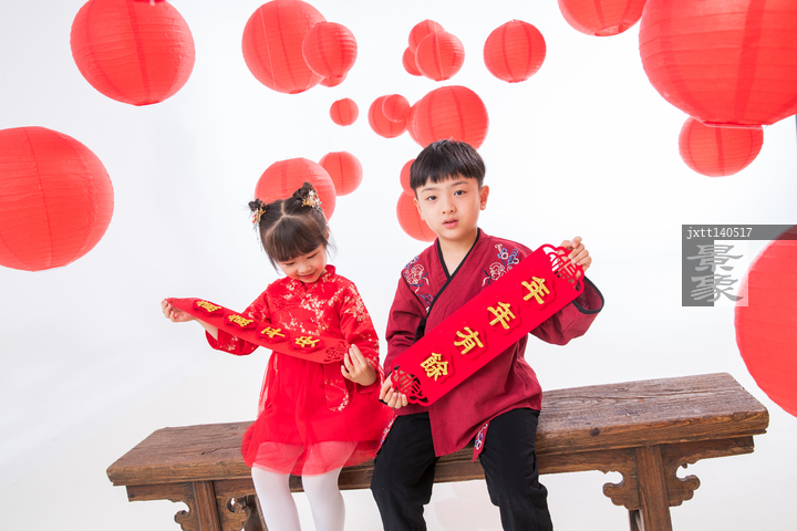 图片标题:     欢乐的男孩女孩拿着春联庆祝新春