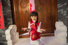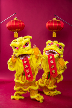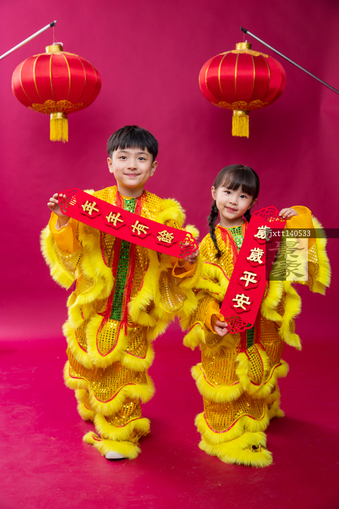 图片标题: 舞狮子的男孩女孩庆祝新年