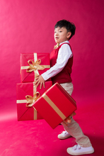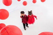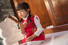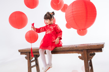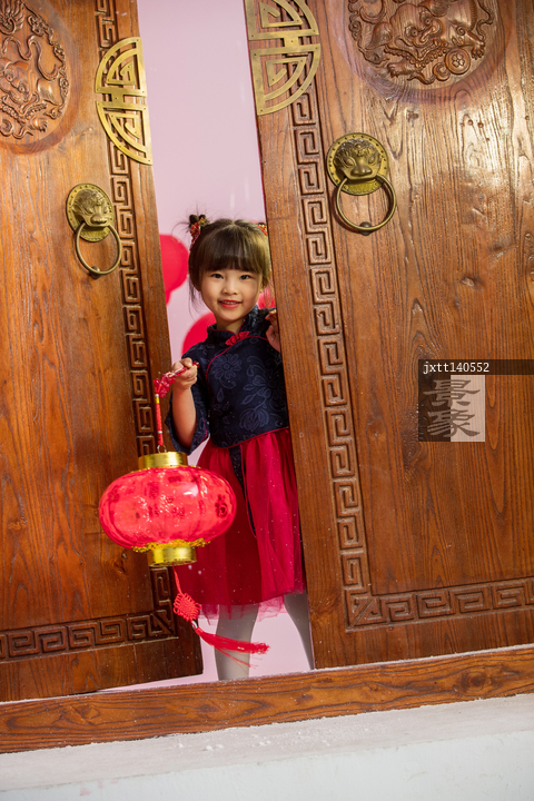 图片标题: 可爱的小女孩拿着红灯笼站在大门口