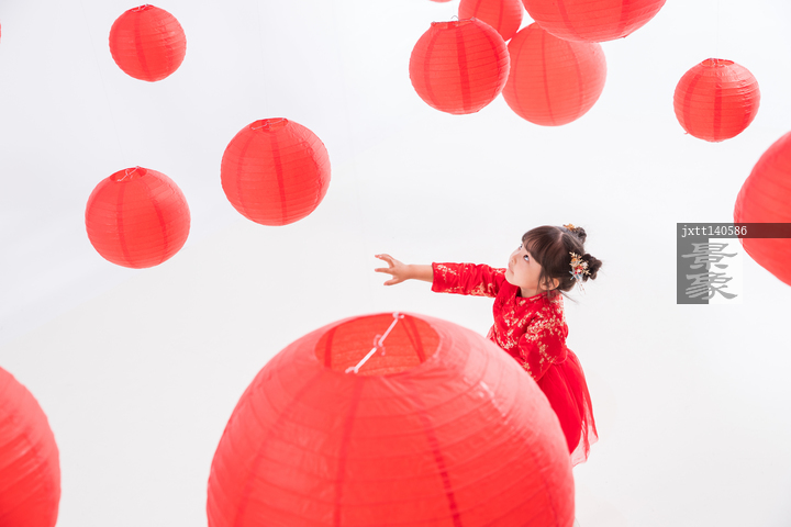 图片标题: 快乐的小女孩在红灯笼下玩耍