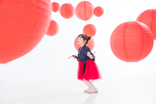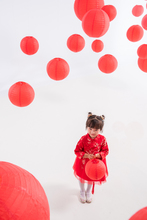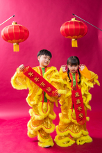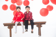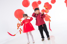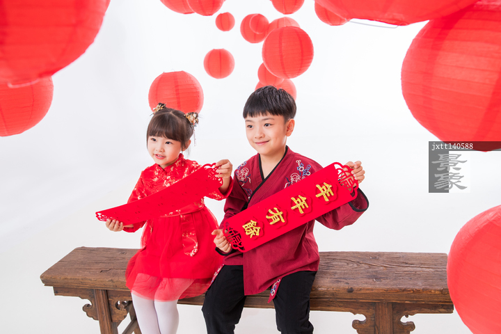 图片标题: 欢乐的男孩女孩拿着春联庆祝新春