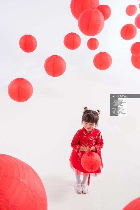 图片标题: 快乐的小女孩在红灯笼下玩耍