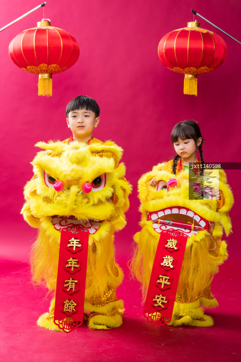 图片标题: 舞狮子的男孩女孩庆祝新年