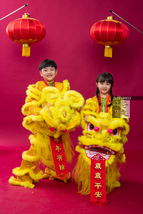 图片标题:     舞狮子的男孩女孩庆祝新年