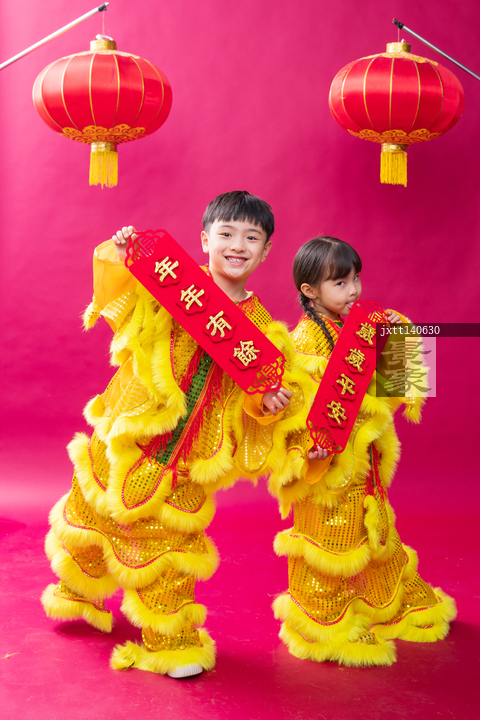 图片标题:     舞狮子的男孩女孩庆祝新年