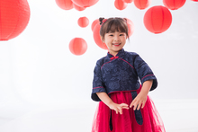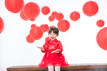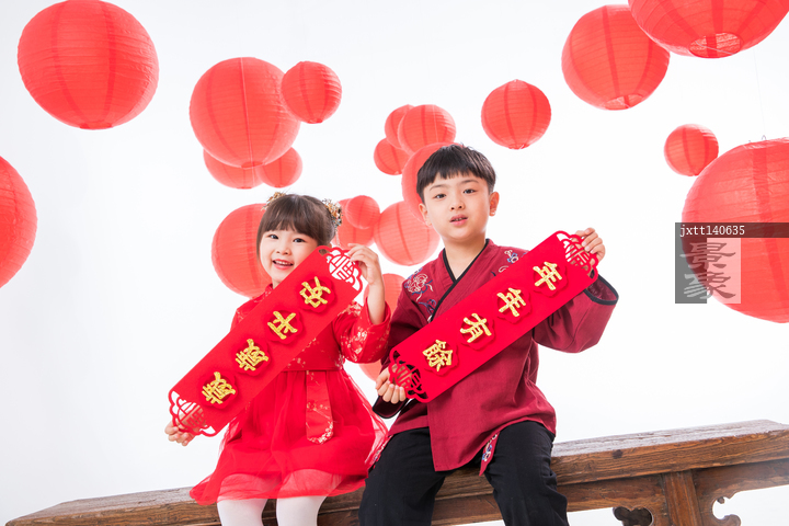 图片标题: 欢乐的男孩女孩拿着春联庆祝新春
