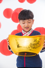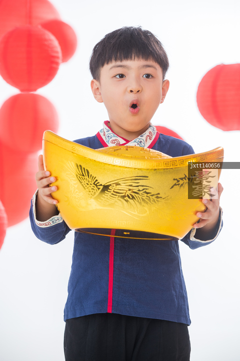 图片标题: 快乐的小男孩抱着金元宝