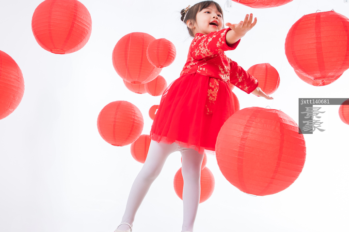 图片标题: 快乐的小女孩拿着红灯笼玩耍