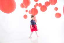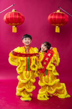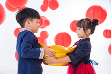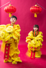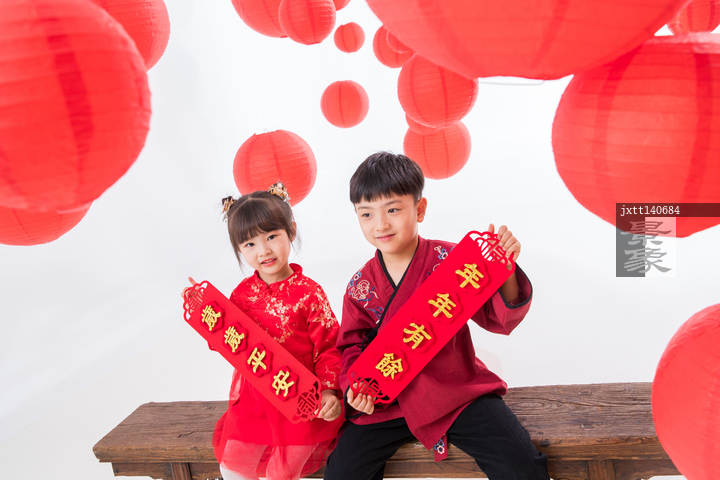 图片标题: 欢乐的男孩女孩拿着春联庆祝新春