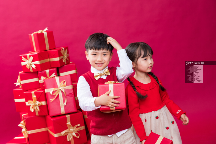 图片标题: 快乐儿童拿着新年礼物