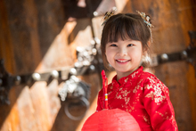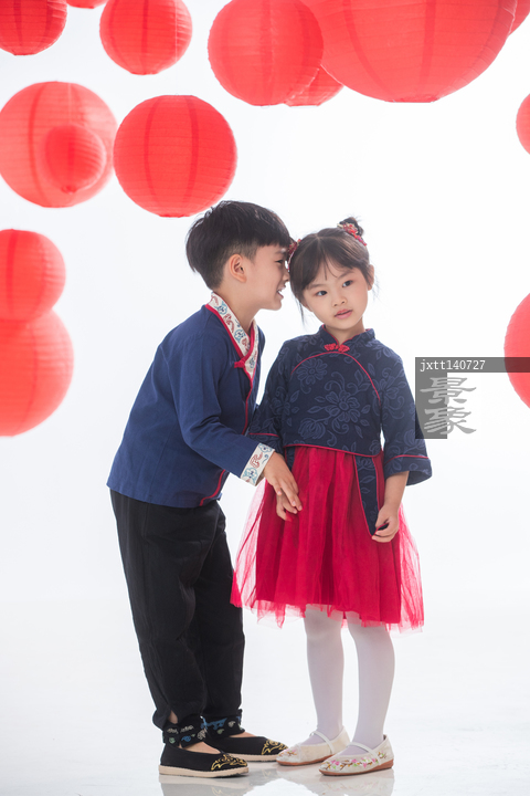图片标题: 红灯笼下玩耍的快乐男孩和女孩