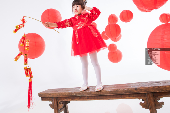 图片标题: 快乐的小女孩拿着红灯笼玩耍