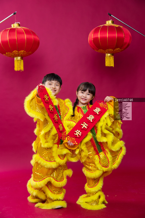 图片标题:     舞狮子的男孩女孩庆祝新年
