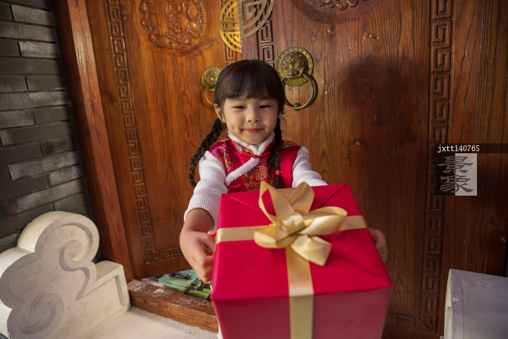 图片标题: 快乐女孩拿新年礼物