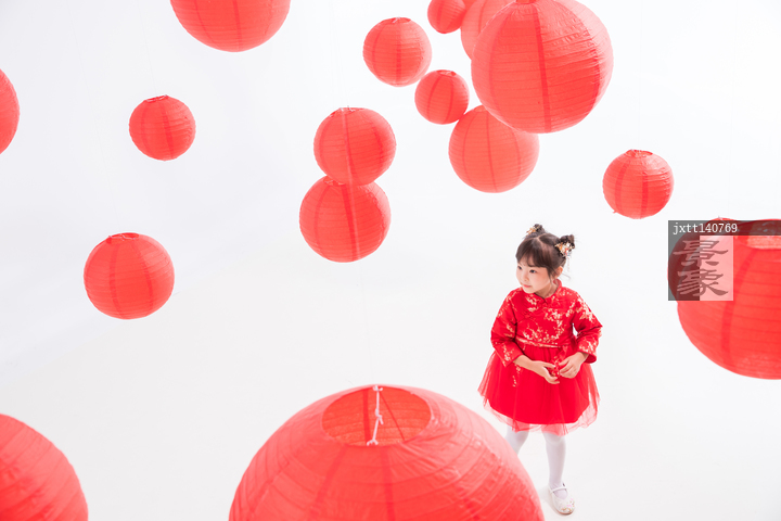 图片标题: 快乐的小女孩在红灯笼下玩耍