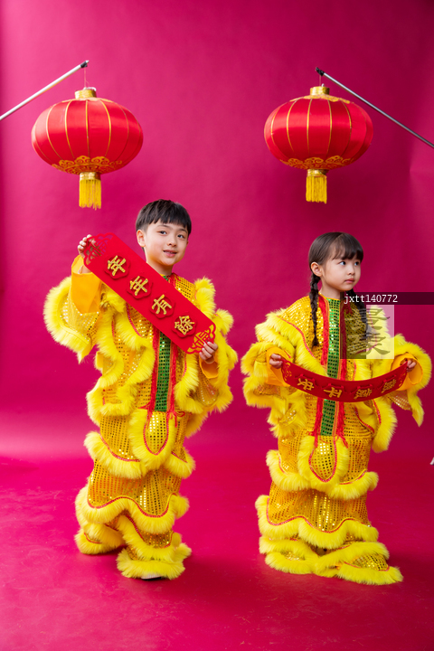 图片标题: 舞狮子的男孩女孩庆祝新年